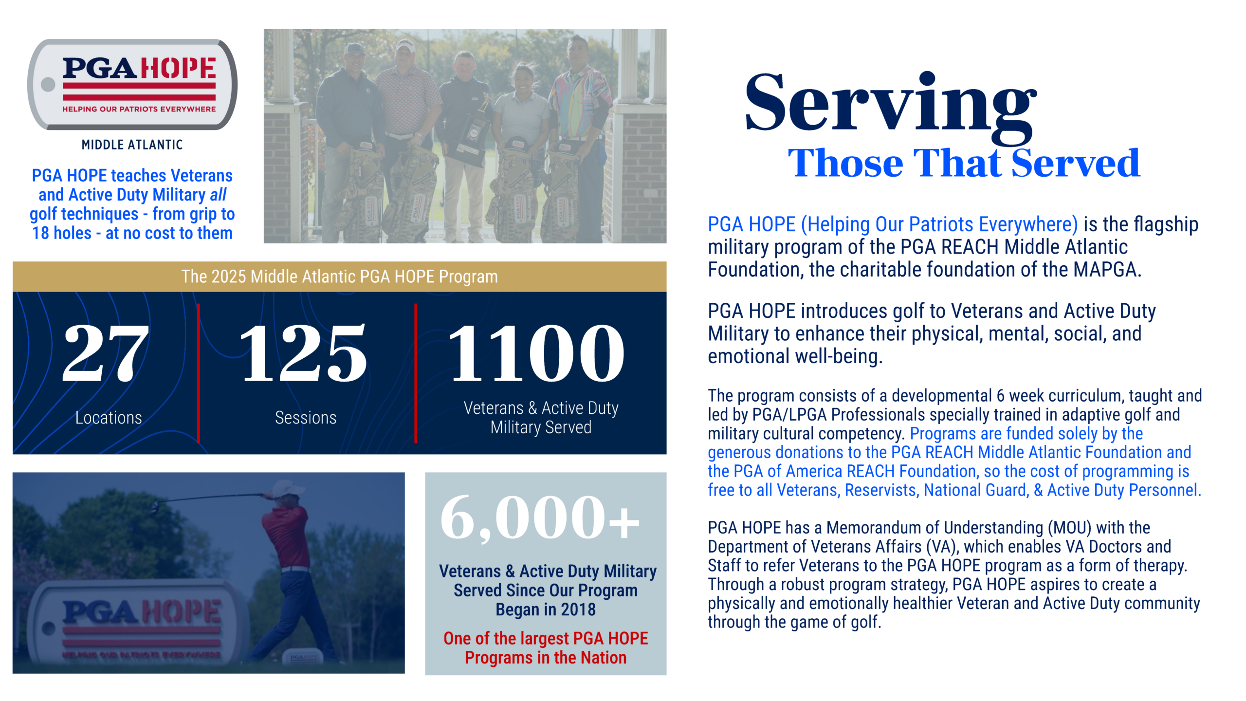 PGA HOPE has a Memorandum of Understanding (MOU) with the Department of Veterans Affairs (VA), which enables VA Doctors and Staff to refer Veterans to the PGA HOPE Program as a form of therapy. Through a robust program strategy, PGA HOPE aspires to create a physically and emotionally healthier Veteran community by shaping lives, changing lives, and possibly saving lives through the game of golf.